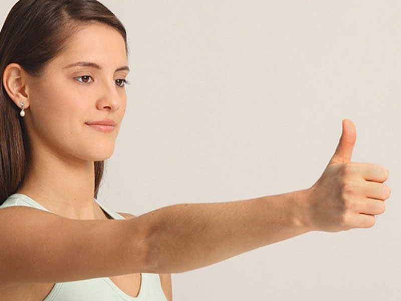 - Động tác 1: Để cánh tay ra trước mặt, song song với mặt đất, cánh tay vuông góc với vai. Lòng bàn tay nắm lại, ngón cái giơ thẳng lên, tập trung mắt nhìn vào ngón cái. Từ từ dùng cánh tay vẽ hình chữ thập, đường tròn càng to càng tốt. Trong khi cánh tay di chuyển, giữ đầu thẳng, mắt nhìn theo ngón cái. Làm động tác này 10 lần, sau đó đổi tay.