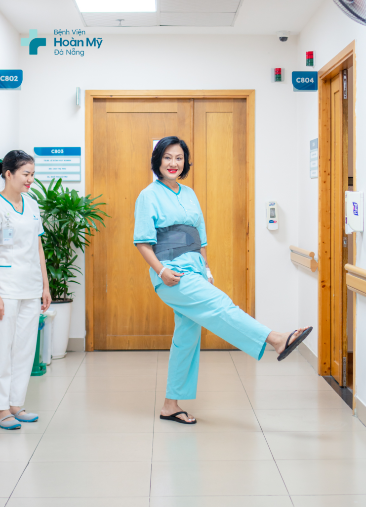 Ngày đầu tiên, ngay sau phẫu thuật, người bệnh đã có thể đứng lên, đi lại nhẹ nhàng. Sau 3 ngày nghỉ ngơi và được các bác sĩ Bệnh viện Hoàn Mỹ Đà Nẵng chăm sóc, chị Đ toàn phục hồi vận động hoàn và đã có thể đi lại thoải mái, cả 2 chân không còn tình trạng tê yếu, đau nhức và được bác sĩ cho xuất viện về nhà sau phẫu thuật 4 ngày.