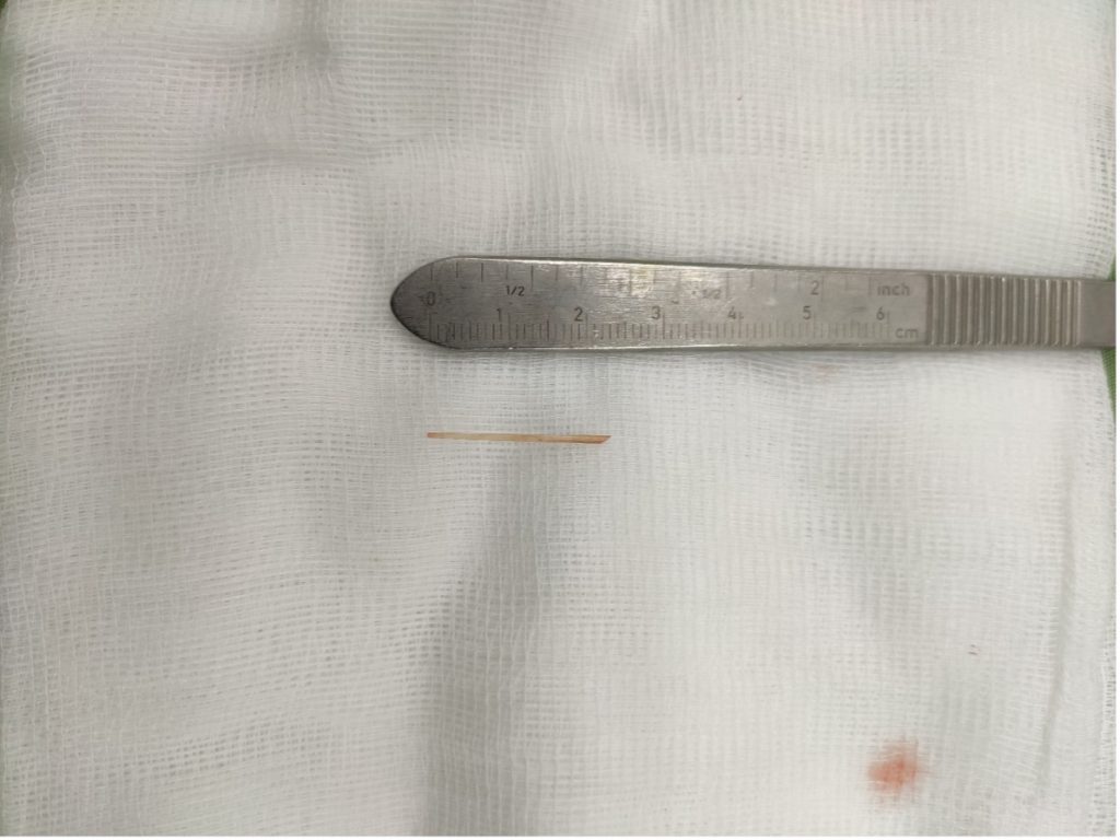 Sau khi thăm khám và thực hiện cận lâm sàng: kết quả MSCT bụng phát hiện dị vật trong lòng dạ dày dài khoảng 23 mm, đâm xuyên thành trước môn vị, thâm nhiễm quanh môn vị. Cụ bà được chẩn đoán dị vật đường tiêu hoá, nghi xương cá.