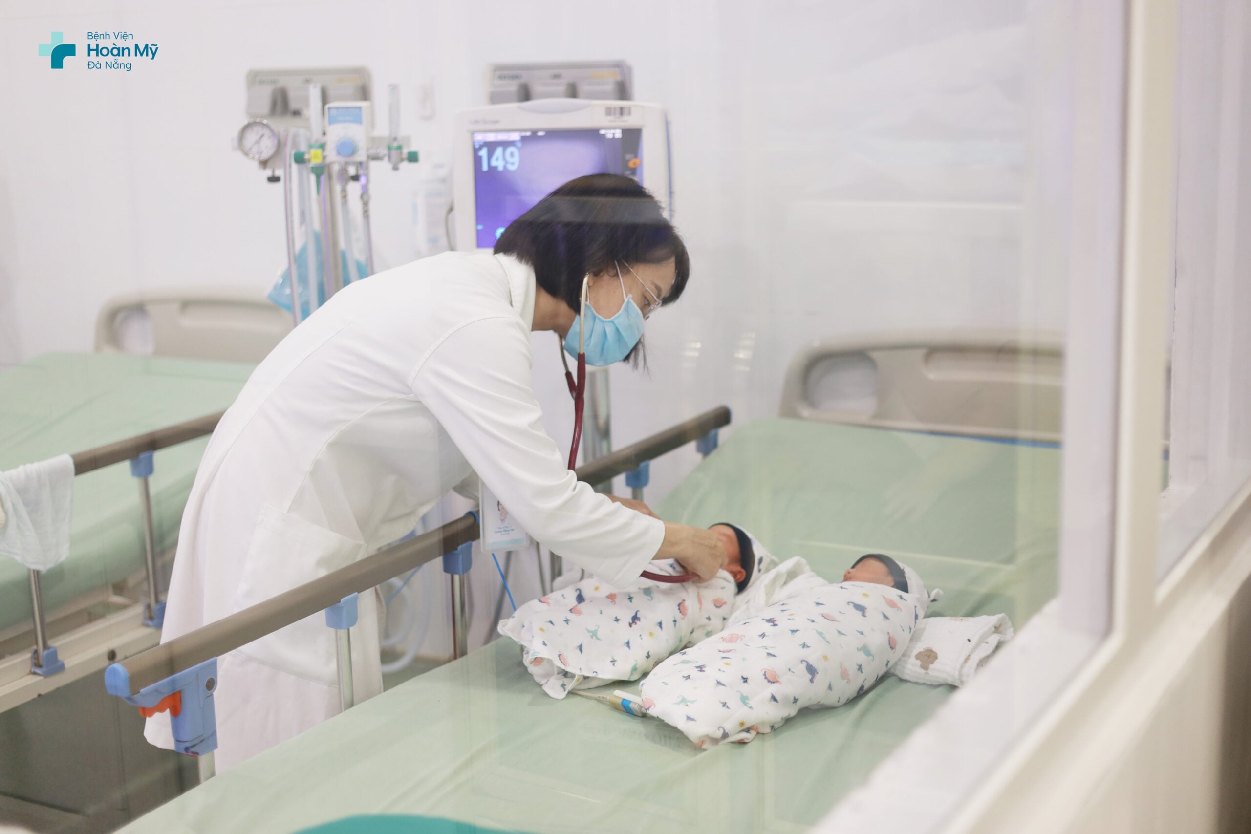 Sau sinh khoảng 30 phút, cả 2 bé bắt đầu thở nhanh, thở rên, có dấu hiệu suy hô hấp sơ sinh. Ngay lập tức, bé được chuyển Đơn nguyên sơ sinh – Khoa Nhi để tiến hành chăm sóc và điều trị.