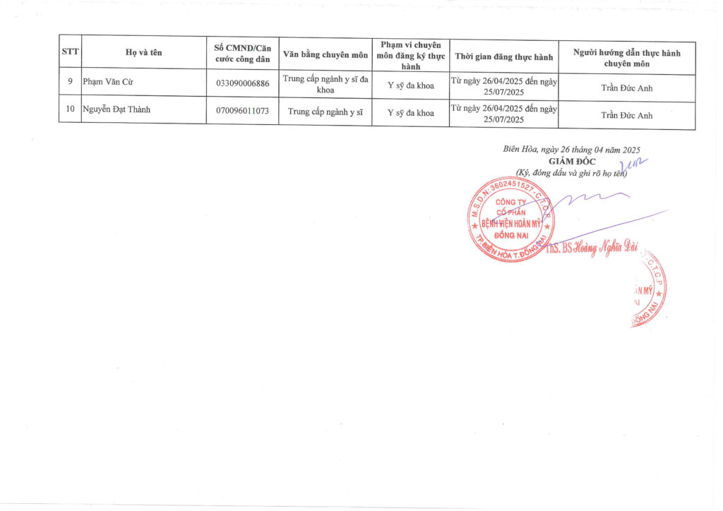 Danh sách đăng ký người thực hành tại cơ sở khám bệnh, chữa bệnh – Bệnh viện Hoàn Mỹ Đồng Nai