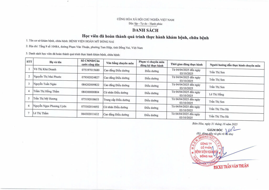 Danh sách học viên hoàn thành quá trình thực hành khám chữa bệnh tại Bệnh viện Hoàn Mỹ Đồng Nai đến ngày 31.10.2025