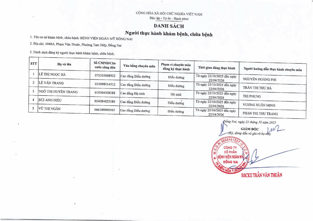 Danh sách người thực hành khám chữa bệnh tại Bệnh viện Hoàn Mỹ Đồng Nai ngày 31.07.2025