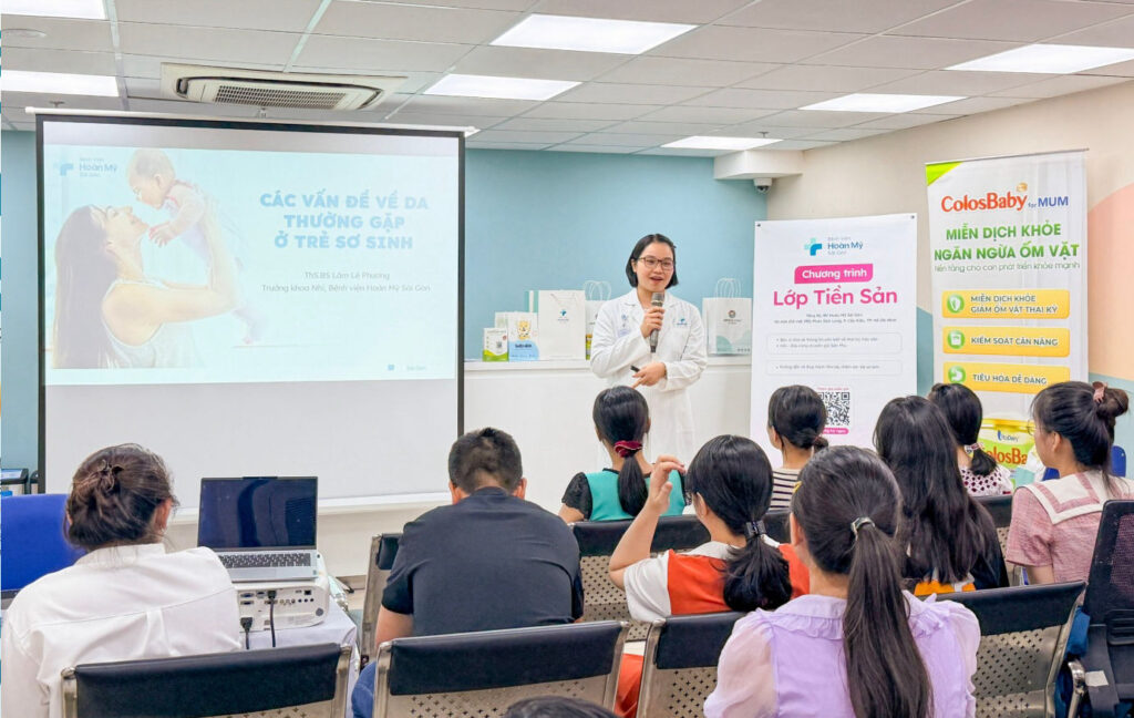 Continuing the program, Master of Science, Dr. Lam Le Phuong, Head of the Pediatrics Department, Hoan My Sai Gon Hospital, delivered practical knowledge on newborn skin care, helping parents distinguish between normal physiological changes and pathological signs. Her guidance on bathing, skin hygiene, and choosing appropriate products received many questions and positive feedback.