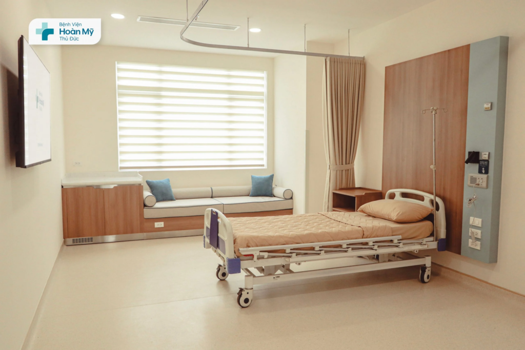 The premium inpatient ward at Hoan My Thu Duc Hospital has been developed with the goal of providing a comfortable, relaxing, and standardized hospitalization experience. Each room is designed to ensure privacy and tranquility, creating optimal conditions for patients requiring close monitoring or postoperative recovery.