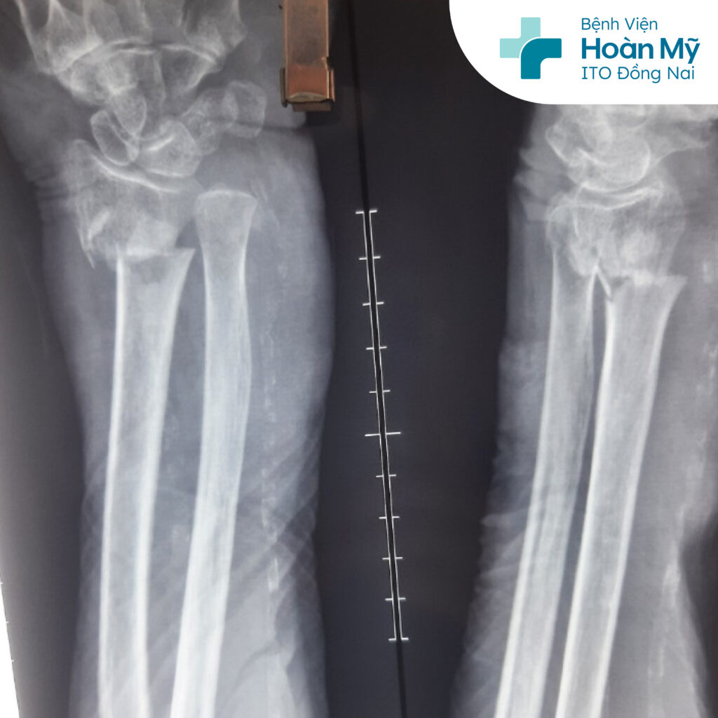 Cụ bà N.T.T, 103 tuổi, ngụ tại Định Quán, Đồng Nai, bị té ngã khi vừa đi tắm ra tại nhà. Mặc dù có gậy hỗ trợ nhưng vì trơn trượt cụ chống tay trái xuống nền. Sau té, cụ T bị đau nhiều ở cẳng tay trái nên được người nhà đưa lên bệnh viện Hoàn Mỹ ITO Đồng Nai cấp cứu. Qua thăm khám và chụp X-quang kết quả cụ bị gãy hở đầu dưới xương quay tay trái, với nhiều bệnh lý nội khoa đi kèm là cao huyết áp, tiểu đường, hở van tim, suy dinh dưỡng…