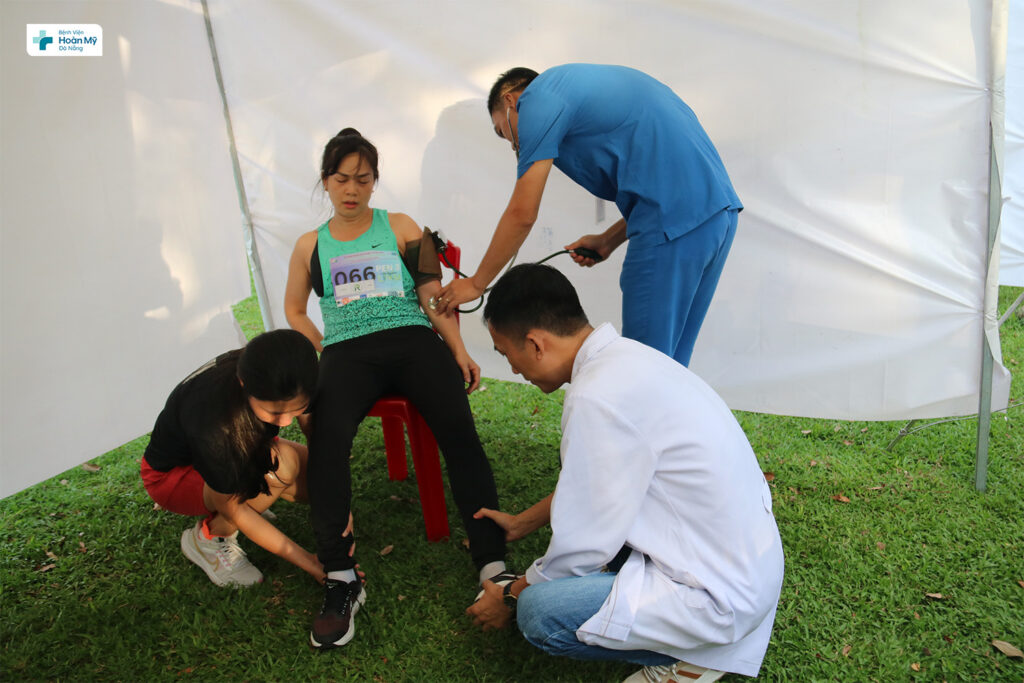 Hòa cùng sức nóng của giải chạy, bên cạnh nhiệm vụ hỗ trợ y tế, tổ y tế - Bệnh viện Hoàn Mỹ Đà Nẵng cũng chia sẻ, hướng dẫn kỹ năng sơ cấp cứu ban đầu trong các trường hợp say nắng, say nóng, chấn thương, tai nạn khẩn cấp và gửi tặng runners cẩm nang sơ cấp cứu cơ bản.
