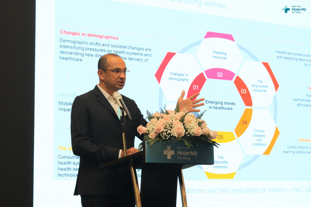 ThS.BS. Dilshaad Ali Bin Abas Ali - Tổng giám đốc Tập đoàn Y khoa Hoàn Mỹ chia sẻ tại hội nghị