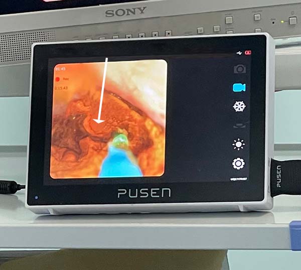 Khi soi xuống ống mật chủ, các Bác sĩ phát hiện vẫn còn một viên sỏi khoảng 15mm bị kẹt ở đoạn cuối ống mật chủ và không thể lấy bằng dụng cụ Randal.