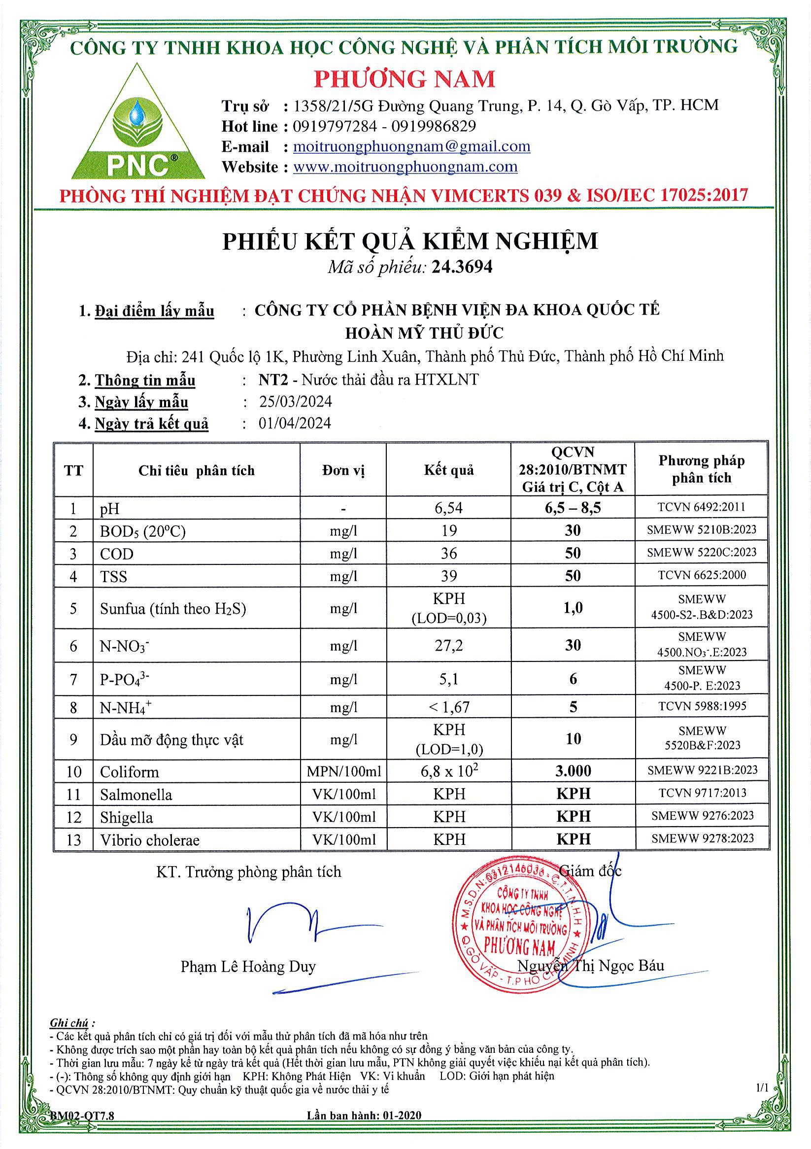 Kết quả mẫu nước thải quý I – 2024 – Bệnh viện Hoàn Mỹ Thủ Đức