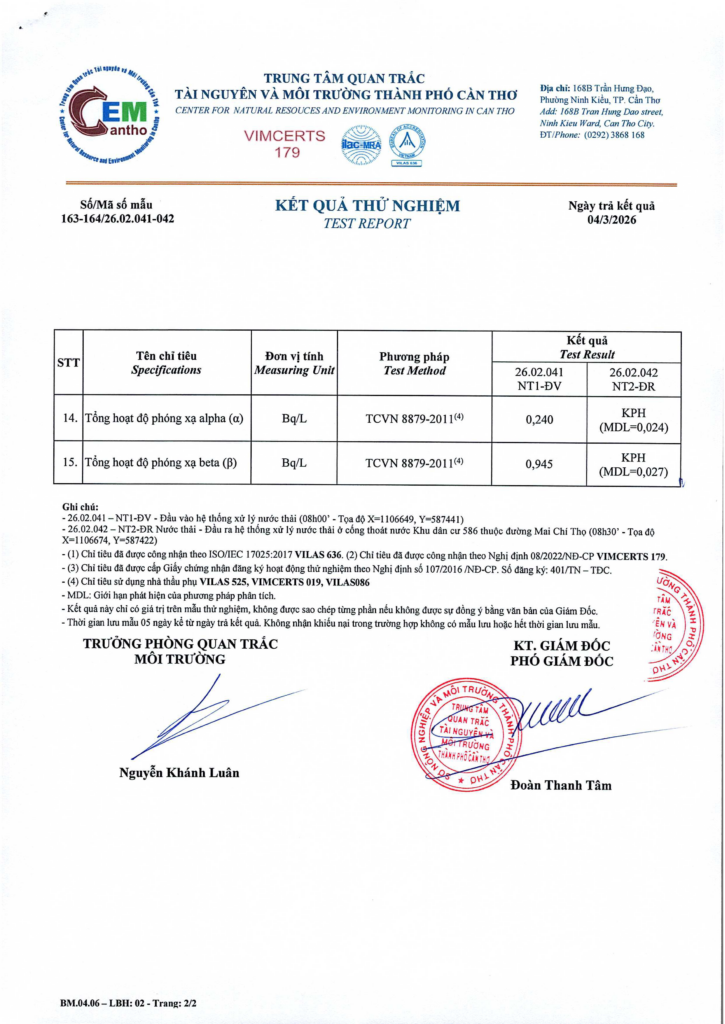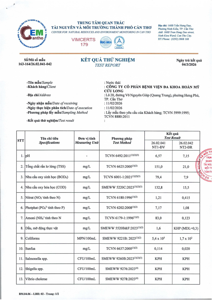 Kết quả quan trắc học quý I – 2026 – Bệnh viện Hoàn Mỹ Cửu Long
