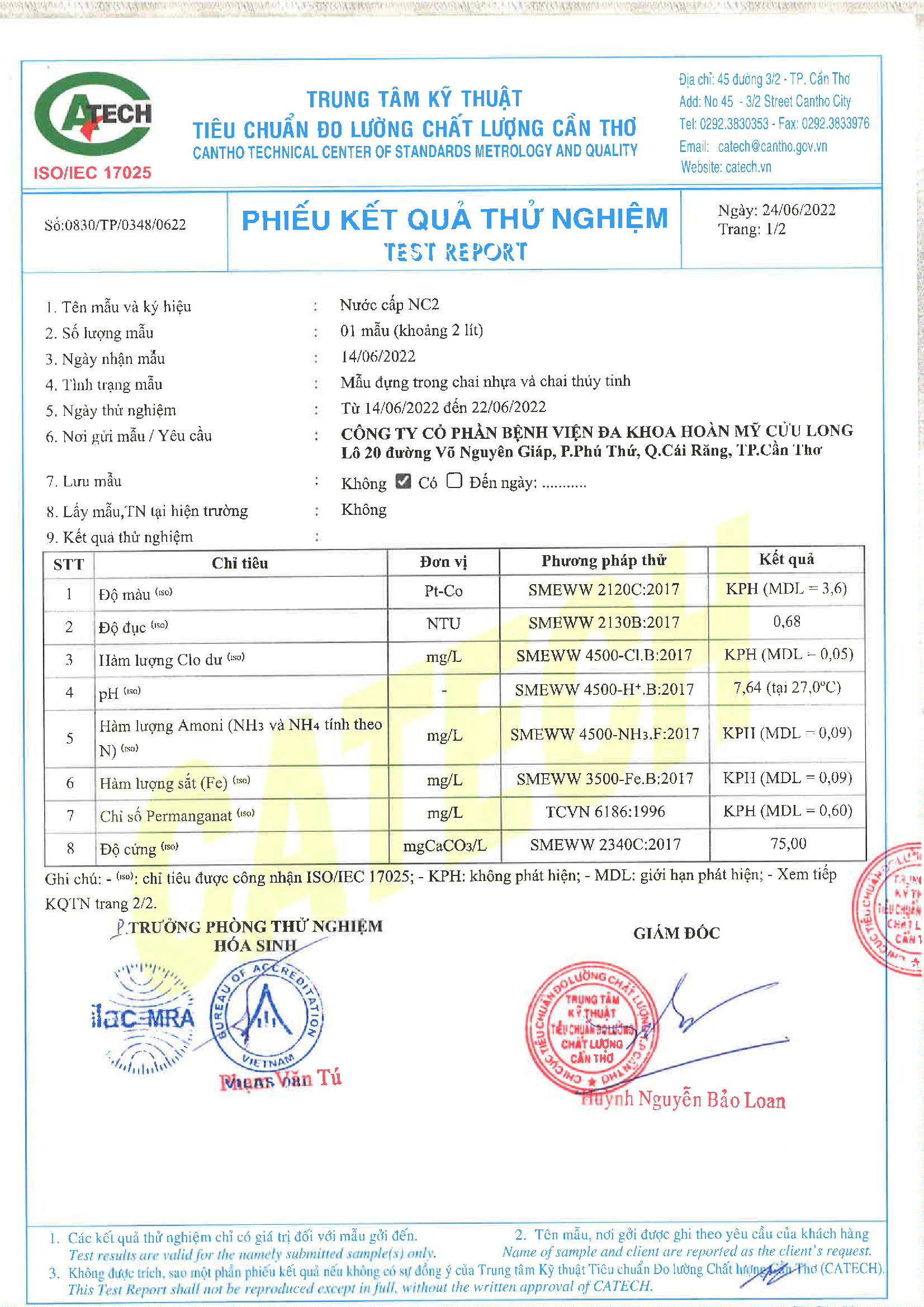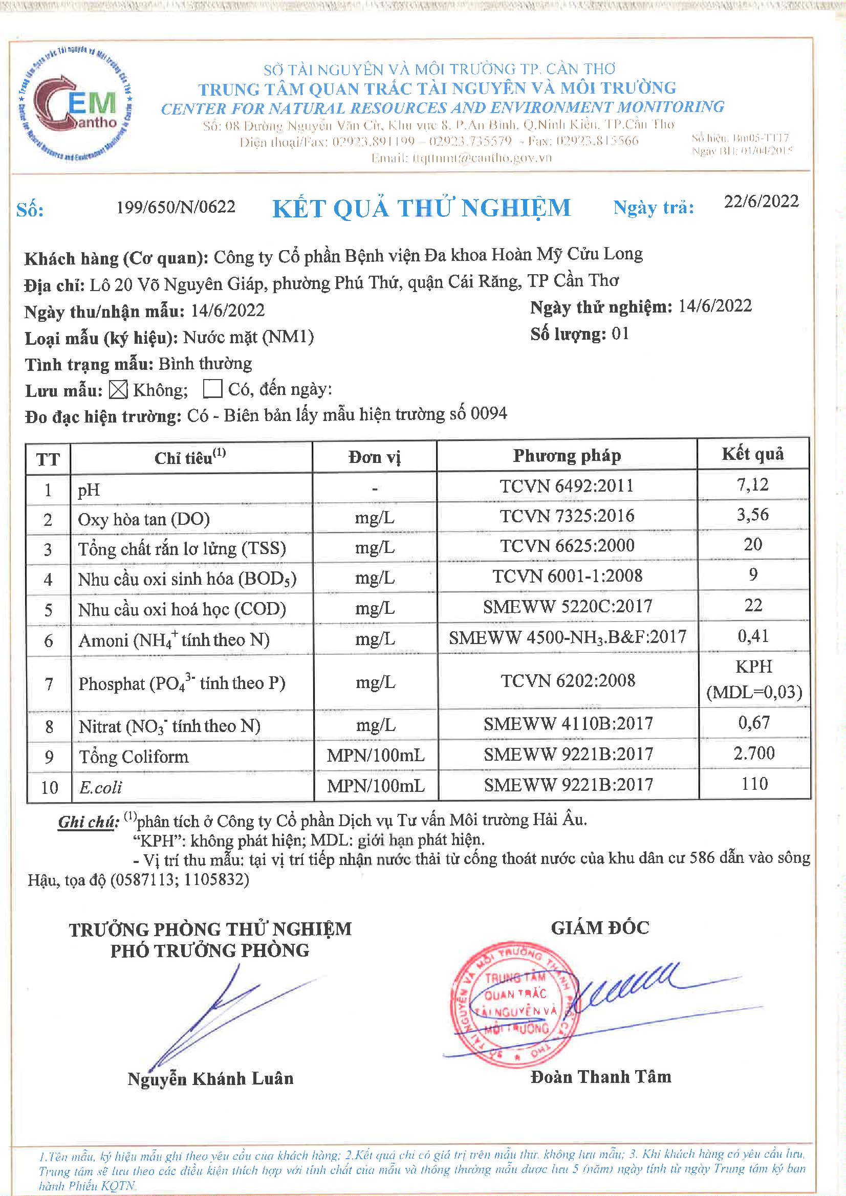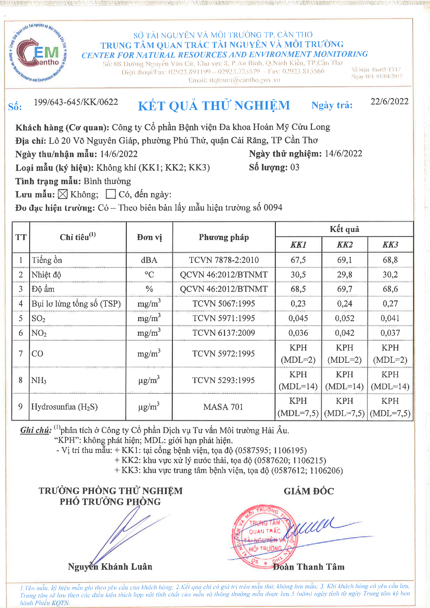 Kết quả quan trắc học quý II – 2022 Bệnh viện Hoàn Mỹ Cửu Long