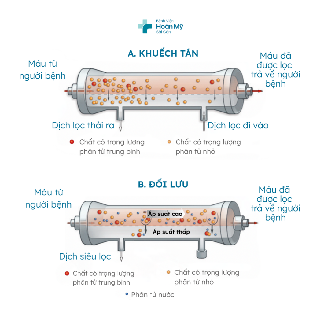 HDF Online kết hợp hai cơ chế lọc máu: khuếch tán (diffusion) giúp loại bỏ các chất độc nhỏ và đối lưu (convection) giúp loại bỏ hiệu quả cả độc chất trung bình