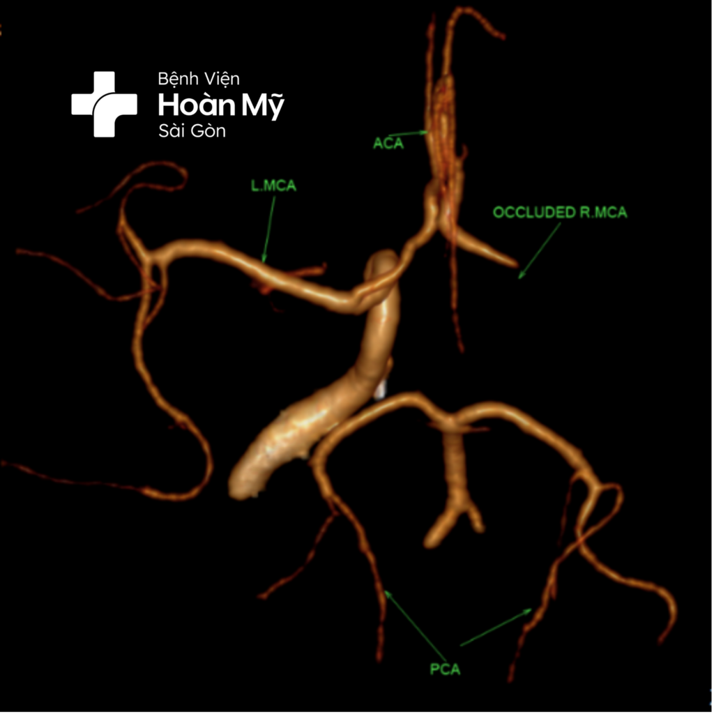 Hình ảnh CT mạch máu não trước can thiệp: Tắc hoàn toàn ĐM cảnh trong và não giữa phải