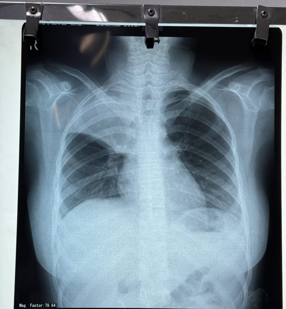 Sau khi thăm khám và thực hiện các cận lâm sàng cần thiết, kết quả X-quang phổi có hình ảnh đám mờ đồng nhất thùy trên phổi phải. Sau đó bé được chụp cắt lớp vi tính MSCT ngực ghi nhận kết quả: xẹp toàn bộ thùy trên phổi phải, kèm thâm nhiễm tạo đám mờ đồng nhất. Các xét nghiệm khác chưa ghi nhận bất thường.