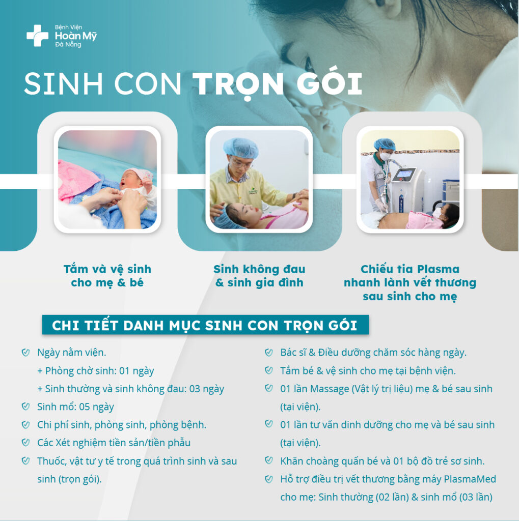 Lựa chọn dịch vụ sinh con trọn gói, ba mẹ hoàn toàn nhẹ gánh khi không phải đắn đo lựa chọn, tìm kiếm và chuẩn bị những điều tốt nhất cho mẹ và bé, bởi mọi danh mục, chi tiết, quy trình chăm sóc, vượt cạn, chăm sóc sau sinh toàn vẹn dành cho mẹ và bé đã được gói gọn khi mẹ đăng ký trọn gói đi sinh. Đặc biệt, khi tin chọn dịch vụ thai sản trọn gói Hoàn Mỹ Đà Nẵng, bên cạnh chi phí gói sinh hợp lý, đội ngũ bác sĩ, nữ hộ sinh chuyên môn cao, tận tâm của Khoa Phụ Sản – Bệnh viện Hoàn Mỹ Đà Nẵng sẽ giúp mẹ vượt cạn suôn sẻ, bé chào đời khỏe mạnh.