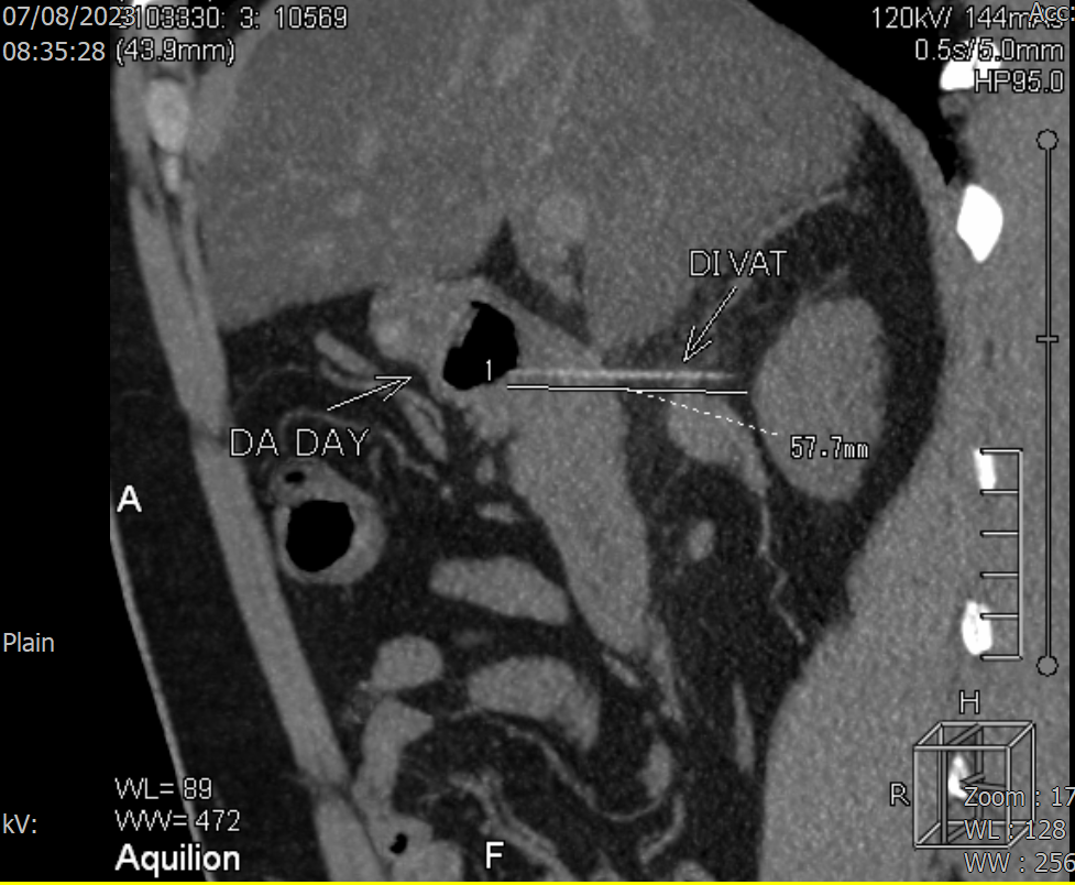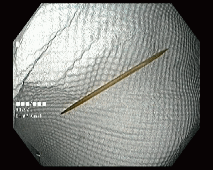 Tại Khoa Cấp cứu, nhận định ông Q. có khả năng bị thủng dạ dày do nuốt phải dị vật, các bác sĩ chỉ định ông Q. thực hiện chụp CT bụng chậu khẩn. Kết quả phát hiện dị vật dạng que thẳng, đường kính 2mm dài 4,5cm xuyên thành mặt sau hành tá tràng vào mô mỡ phúc mạc.