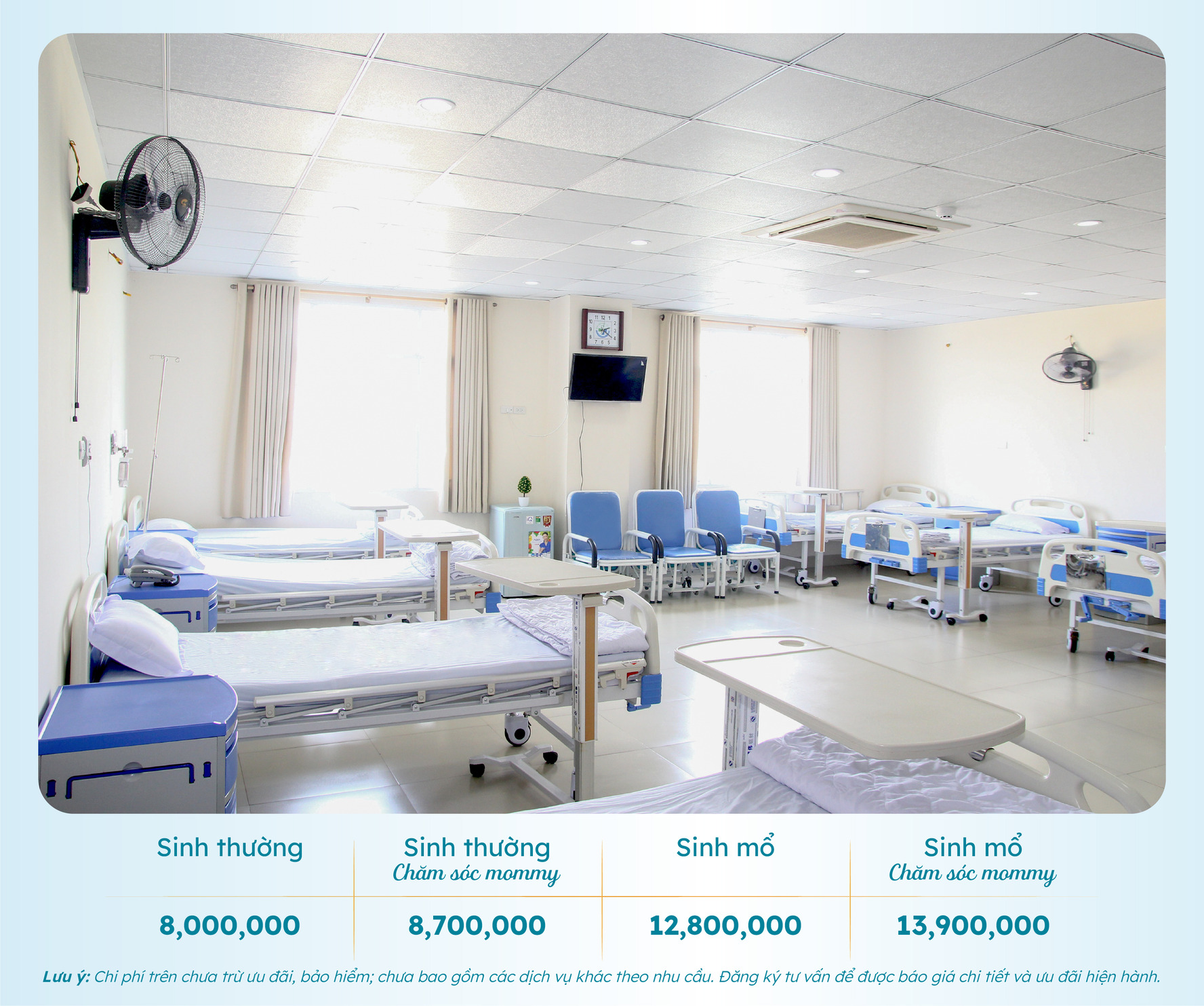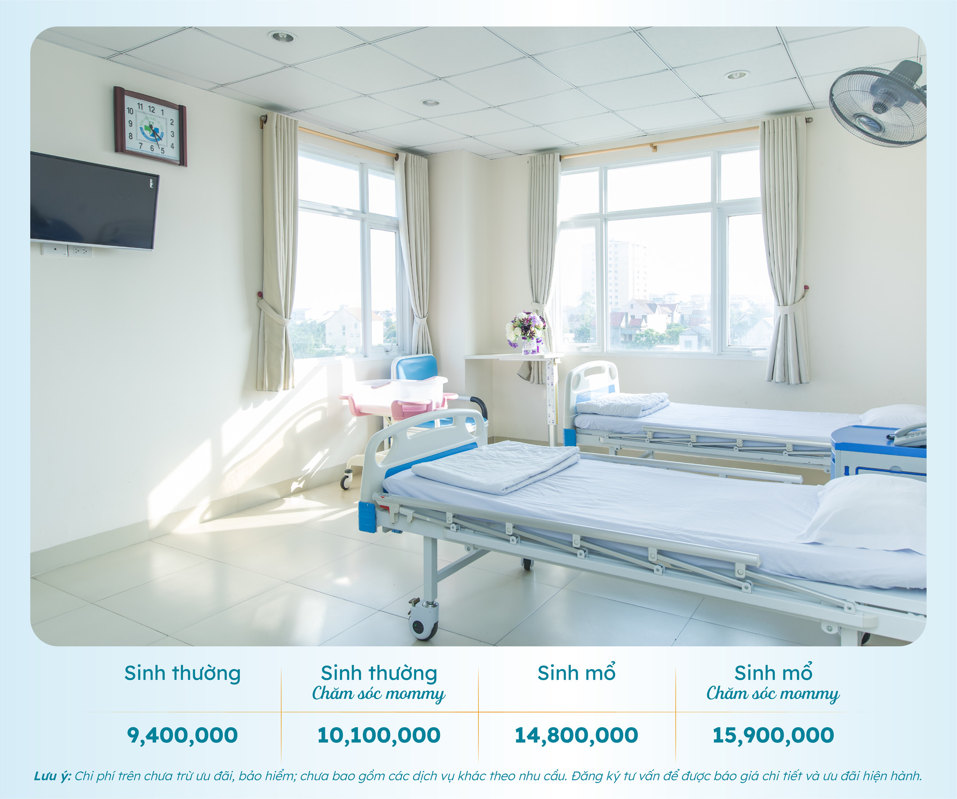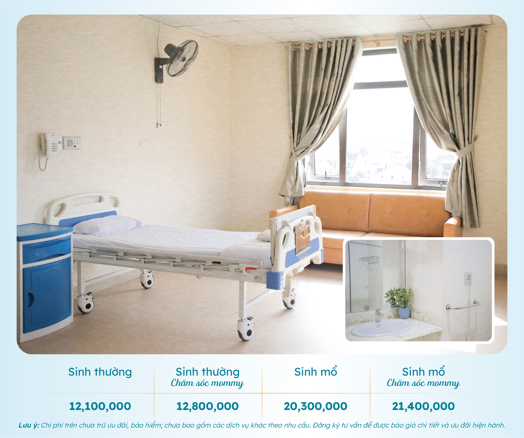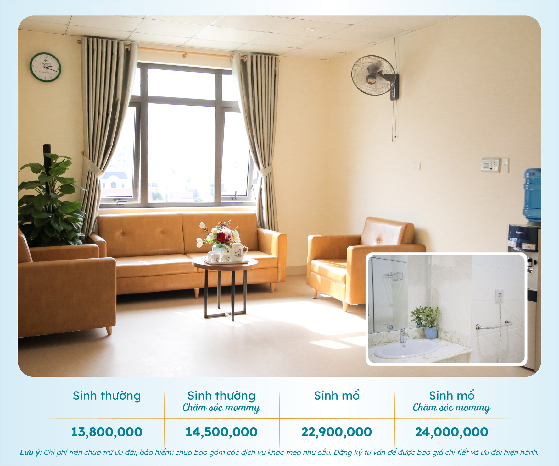 | Phòng nghỉ | Số ngày lưu trú (3 ngày với sinh thường, 6 ngày với sinh mổ) Người nhà được nhận phòng khi mẹ chờ sinh |